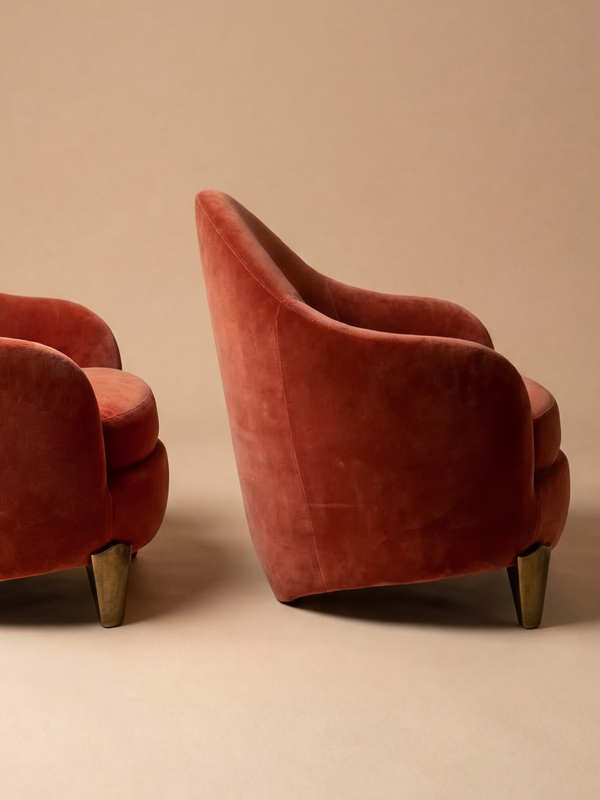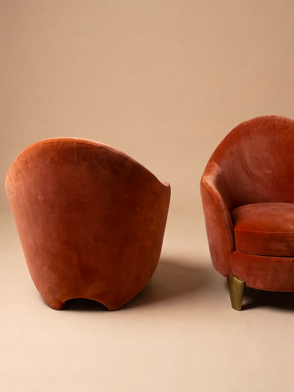 This pair of Koala armchairs by Elizabeth Garouste and Mattia Bonetti, edited by BGH, embodies the organic and poetic approach of late 20th-century French design. Their generous, enveloping curves form a soft, almost biomorphic silhouette, both playful and refined. Upholstered in a deep rust velvet, they offer a rich texture that subtly catches the light, enhancing the sensuality of the volumes. The patinated bronze legs provide a solid base and a refined contrast to the softness of the fabric. Balancing comfort and artistic expression, these armchairs transcend their function to become true collectible design pieces. Ideal in a curated interior, they bring warmth, character, and a strong decorative presence. Monogrammed “BG” on the feet.