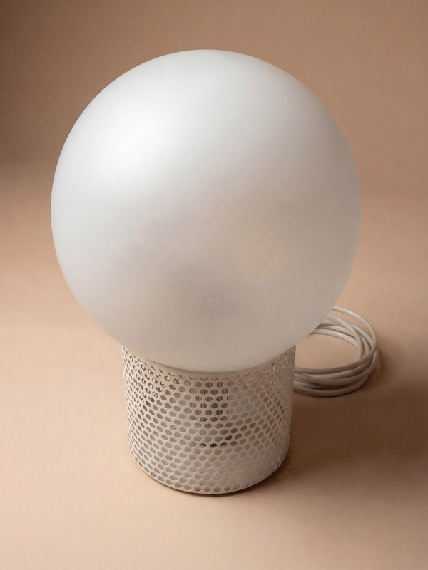 This piece reflects a refined and rigorous vision of French design, where geometric simplicity becomes a strong formal statement. The opaline glass sphere emits a soft and even light, creating a warm and enveloping atmosphere. It rests on a perforated white lacquered metal base, whose regular pattern produces a subtle interplay of light and shadow. Both minimal and expressive, this lamp combines purity of form with a rich lighting effect. An iconic piece, ideal for adding structure and character to an interior. A pair available.