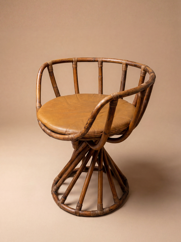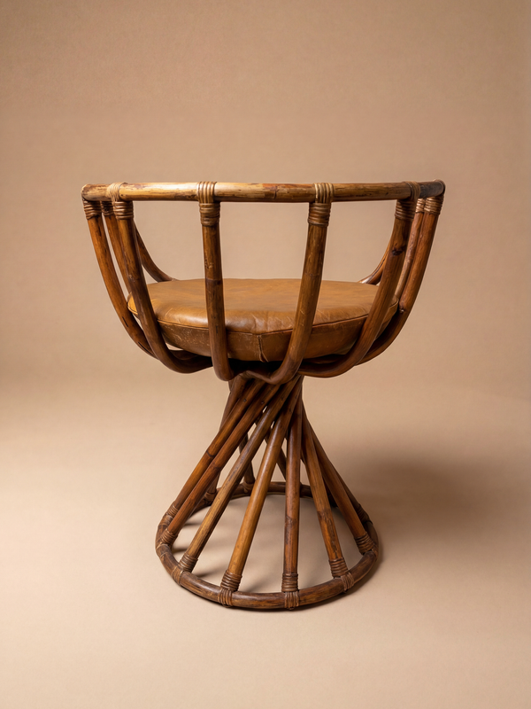 These Manille Écorsé chairs, designed by Bernard Govin and edited by Eguizier, reflect a distinctive approach to seating from the 1960s–1970s, where structure itself becomes expression. The circular backrest and enveloping seat convey an immediate sense of comfort while asserting a strong, recognizable silhouette. The sculptural base, formed from twisted strips of stripped rattan, creates a dynamic, almost architectural presence. The rhythm of the uprights and the visible craftsmanship give the piece a raw yet controlled character, typical of Govin’s organic modernism. The leather seat adds warmth and balance, softening the graphic intensity of the structure. The chairs are offered individually, with three pieces available. The indicated price is per chair. They work equally well as standalone sculptural accents or grouped together to form a coherent and expressive ensemble.