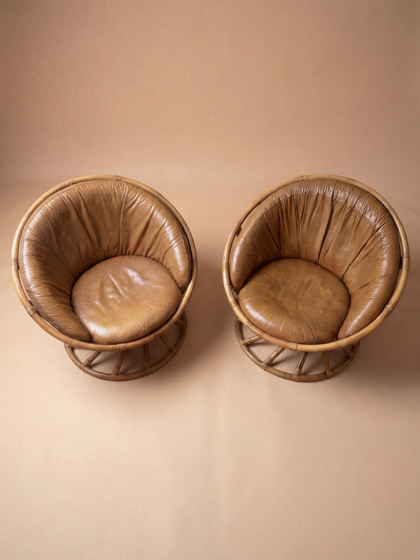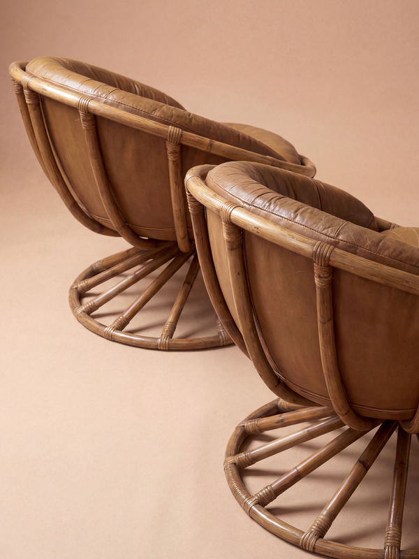 These sculptural lounge chairs by Bernard Govin embody the relaxed modernity of French design from the late twentieth century. Their generous, enveloping silhouettes rest low to the ground, creating an immediate sense of comfort and informality while maintaining a strong architectural presence. The structure is formed from elegantly bent rattan, articulated by rhythmic vertical supports and a circular pedestal base that gives the chairs a subtle rotational dynamic. The leather upholstery, softly patinated, follows the curves of the shell, emphasizing the organic geometry of the design. Viewed from every angle, these chairs reveal a careful balance between craftsmanship and modern experimentation—an approach characteristic of Govin’s work, where innovation, comfort, and sculptural clarity coexist with quiet confidence.