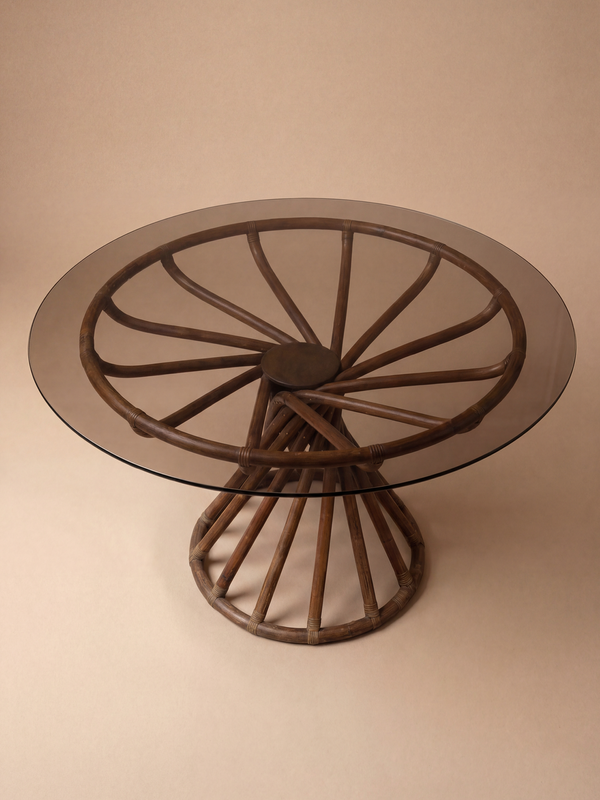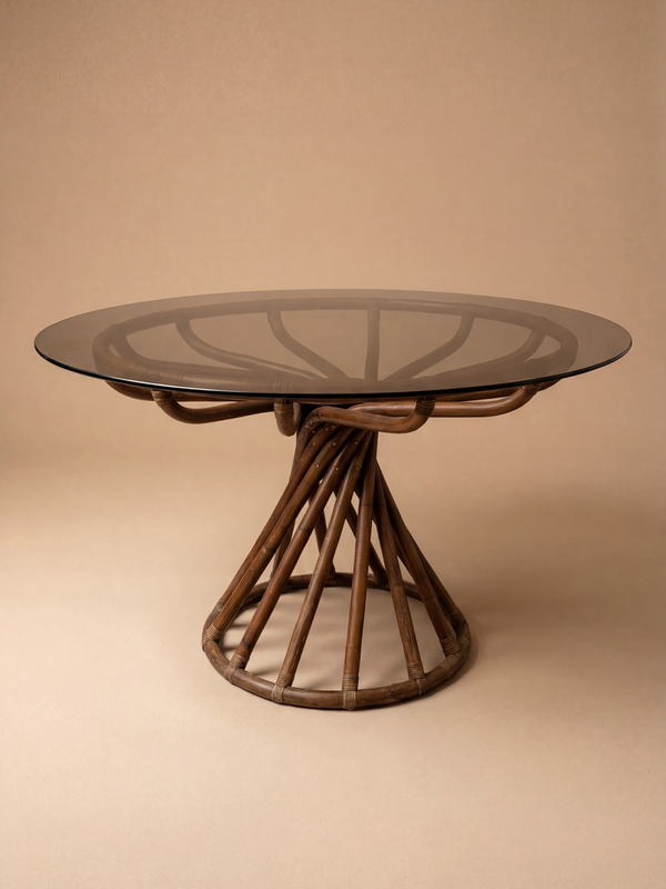 This Table Manille Écorsé, designed by Bernard Govin and produced by Eguizier, offers a sculptural interpretation of late-1960s French design, where structure and material become the primary expressive elements. The round glass top introduces a sense of lightness, allowing the complex base to remain fully visible. The pedestal is composed of interlaced rattan elements arranged in a dynamic, radial composition. This “écorsé” construction reveals the logic of assembly, transforming functional supports into a rhythmic, almost architectural form. The circular base echoes the tabletop, reinforcing the balance and coherence of the whole. Both graphic and organic, the table stands at the crossroads of design and craftsmanship. It reflects Govin’s interest in experimental structures and natural materials, resulting in a piece that is at once elegant, tactile, and distinctly emblematic of its era.