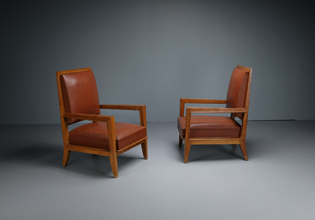 Coming from a line of cabinetmakers, Maxime Old was a precursor of the successful transition from late 1930s style to modern design. Yves Badetz, chief curator at the Musée d’Orsay, responsible for decorative arts, confides: “The emotion in the face of the elegance of Maxime Old’s creations is intense. His aesthetic research centered on the values of rationality freely combines the functional reflections of the Bauhaus with the lessons of the demand for perfection from Ruhlmann. Its success is to trace the clean lines which anticipate the third millennium.” Everything is said here regarding the style of this magnificent pair of armchairs in perfect condition. They can easily find their place in an interior, whether classic or more modern.