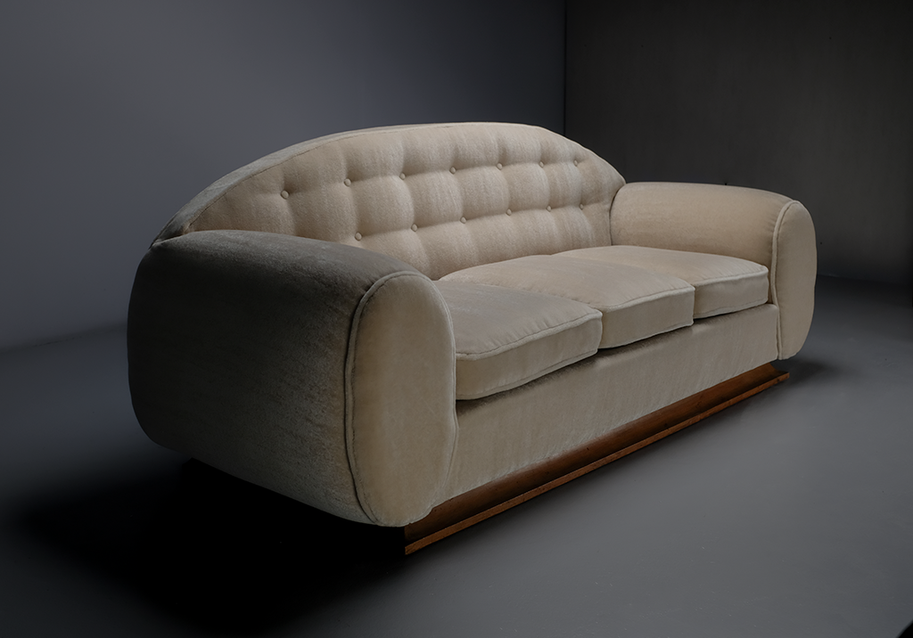 This sofa is a remarkable piece of furniture that hails from the 1940s. Its embodies the monumental elegance of the elephant armchairs and sofas from that period. Designed by the renowned french decorator René Drouet, this sofa showcases his exceptional craftsmanship and distinctive aesthetic. One of the defining features is its big rounded armrest, reminiscent of the iconic works of Jean Royere, another celebrated French designer of the era. The armrest not only adds a touch of grandeur to the sofa but also provides a comfortable place to rest and relax. The demicircle backrest is another notable element of the sofa, with its structured design accentuated by two lines of buttons. This detail not only adds visual interest but also enhances the overall support and comfort of the sofa. Complementing the exquisite design is an elegant wood base that provides a sturdy foundation and adds a touch of warmth and sophistication to the piece. To further elevate its allure, the René Drouet sofa has been fully reupholstered in a luxurious Teddy Mohair fabric sourced from Pierre Frey, sand color. This choice of fabric not only enhances the tactile appeal of the sofa but also adds a layer of opulence and comfort. This René Drouet sofa is a true masterpiece that seamlessly blends timeless design, expert craftsmanship, and luxurious materials. It stands as a testament to Drouet skill and artistry, capturing the essence of 1940s elegance in a way that continues to captivate admirers of fine furniture today.