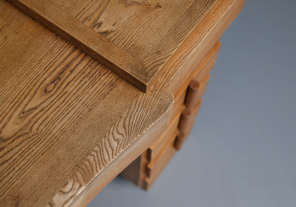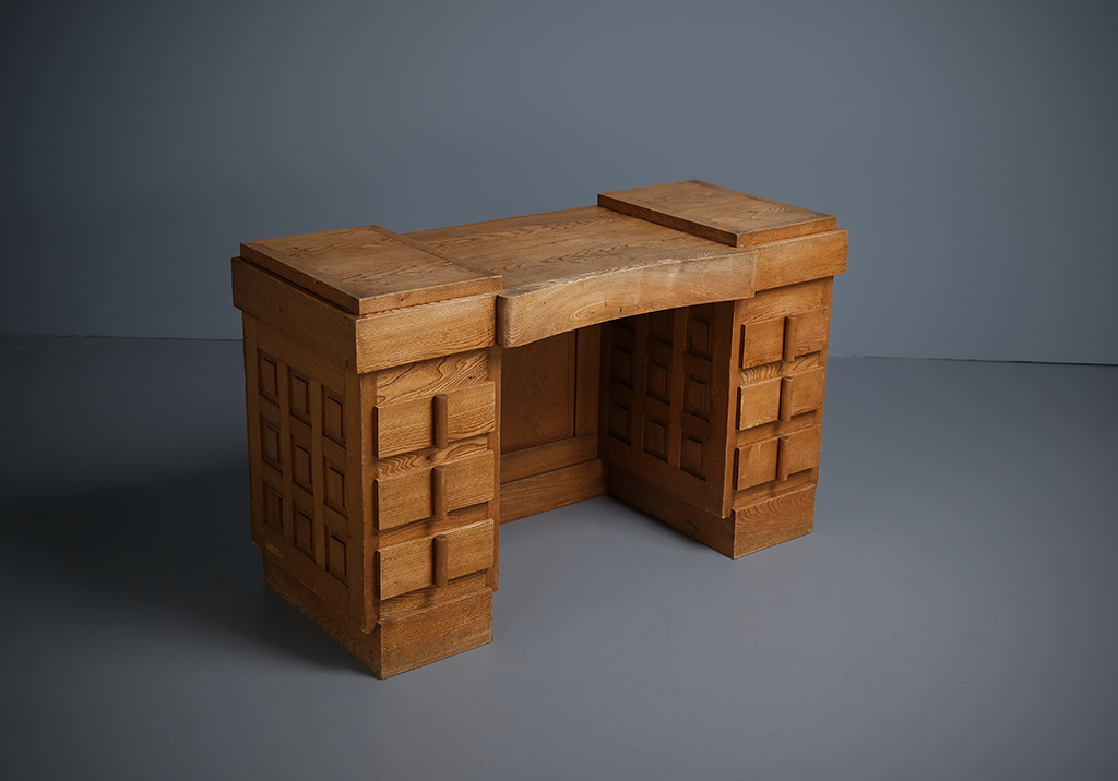 This exquisite ash wood desk, designed by the renowned French architect Henry Jacques Le Meme in the 1940s, is a stunning embodiment of his architectural vision. Le Meme's meticulous attention to detail and innovative design principles are evident in every aspect of this piece. The desk features two side columns, each adorned with a grid layout that decorates both the interior and exterior surfaces. These columns house three drawers each, offering ample storage space and practical functionality. The columns gracefully support the desktop, which includes two convenient storage compartments, perfect for keeping essential items within reach. The desk's design is further enhanced by a sensual, curved edge that warmly invites the user to sit and write, blending comfort with elegance. This desk is intended to be installed against a wall, making it an ideal addition to any home office, study, or workspace. Its timeless design and high-quality craftsmanship reflect the sophisticated style and enduring legacy of Henry Jacques Le Meme. This desk is not only a functional piece of furniture but also a work of art that will elevate the aesthetic of any interior space.
