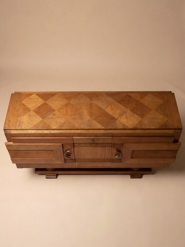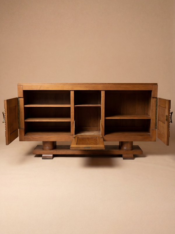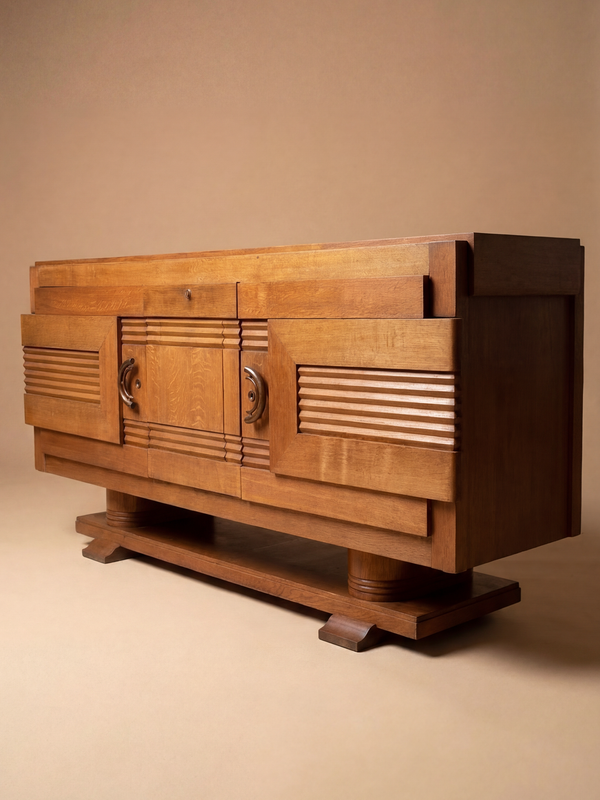 This oak sideboard displays a strong and balanced architectural presence, characteristic of Charles Dudouyt’s design language. The façade is structured through a subtle interplay of volumes in slight relief, emphasized by horizontal fluting and thick framing elements that rhythmically articulate the composition. The projecting side doors frame a more restrained central section, creating a refined contrast between decorative density and geometric clarity. The curved metal handles introduce a softer note, engaging in dialogue with the overall angular structure. The oak, with its warm and luminous tones, reveals a fine and regular grain, enhanced by a soft and even patina. The base, composed of two cylindrical supports resting on a stepped plinth, anchors the piece while reinforcing its sculptural presence.