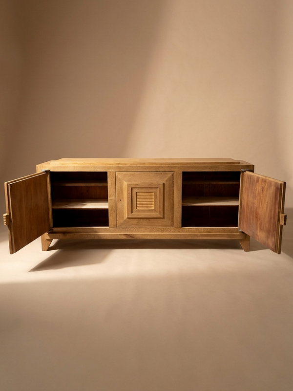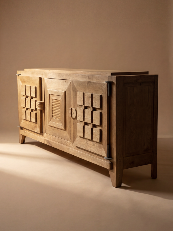 An emblematic work by Charles Dudouyt, showcasing his distinctive approach to carved oak with both strength and expressive freedom. The facades are animated by bold geometric reliefs, creating a striking interplay of light and shadow and a strong architectural presence. The tripartite composition, centered around a structured panel and framed by richly worked doors, reflects a balance between rigor and expressiveness. Wooden handles and discreet metal fittings reinforce the unity and authenticity of the piece. Entirely restored, the sideboard presents beautifully today while respecting its original character. Inside, shelves provide practical storage. This piece perfectly illustrates Dudouyt’s language of the 1930s, combining rustic inspiration, formal modernity, and exceptional craftsmanship.