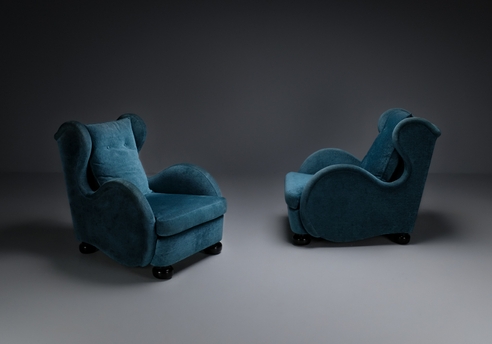 René Drouet (along with André Arbus, Maxime Old and others) is part of that group of decorators who updated the art deco style in the post-war period. These armchairs are evidence of Drouet's defense of the decorator's figure. We see in its accentuated and wide curves, reminiscent of the work of Jean Royère, a balance between exuberance and rationality. It must be said that they are very comfortable, spacious and ergonomic armchairs, ideal for resting next to a fireplace in winter, for example. As they are extremely rare pieces, we did not want to change the fabric that covers them from the outset. But we can take care of it. We suggest, for example, to cover them with an exquisite mohair or a sand colored bouclette fabric. For those who prefer a more classic style, we can also cover them in silk. Documentation : Mobiliere et Décoration, December 1947, p. 29 and 35.