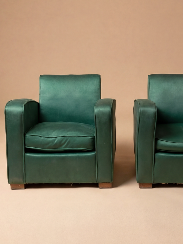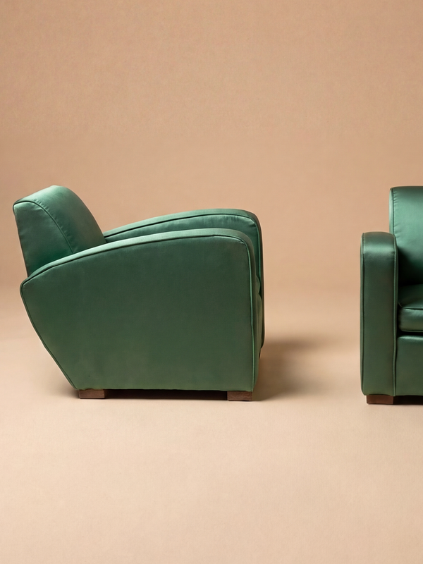 This pair of armchairs features a low and enveloping silhouette, characteristic of the modern comfort of the 1930s. The volumes are full and generous, shaped by soft, continuous lines that give the ensemble both presence and ease. The curved armrests extend naturally from the slightly inclined backrest, creating a fluid and harmonious seating experience. The discreet base allows the purity of the forms to stand out, while the green satin upholstery enhances the curves with elegance and depth. Balancing comfort and formal clarity, these armchairs reflect the spirit of Michel Dufet, embodying a softened Art Deco approach designed as much for use as for line, making them ideal for refined interiors. The armchairs are presented with their original upholstery. Reupholstery is recommended and can be fully carried out in our workshop, with careful attention to preserving the original spirit and proportions.