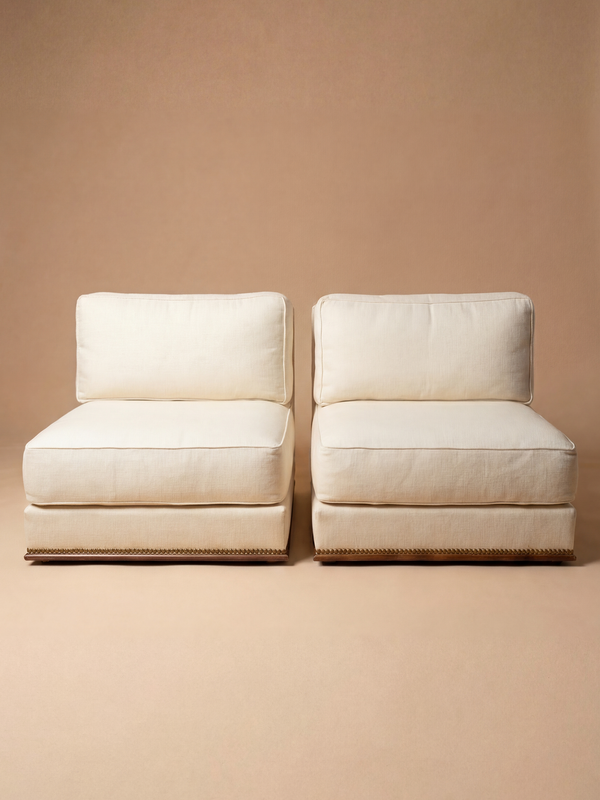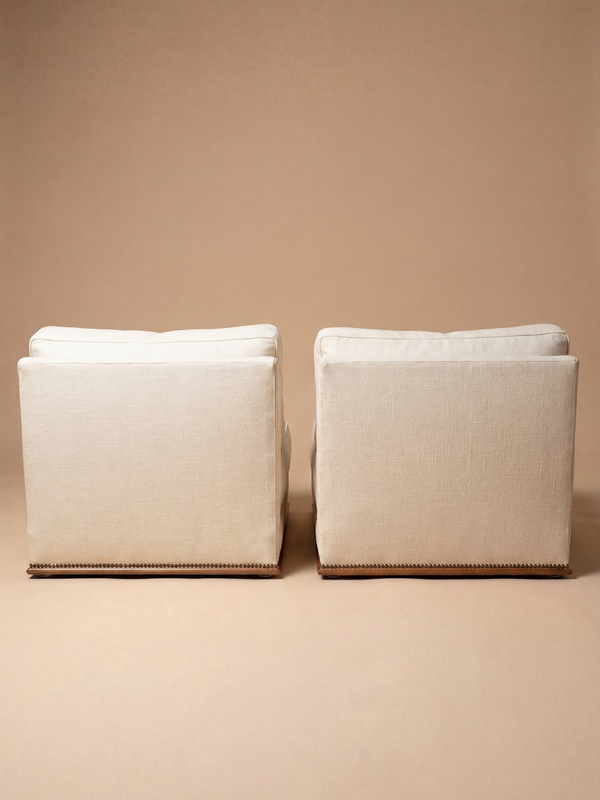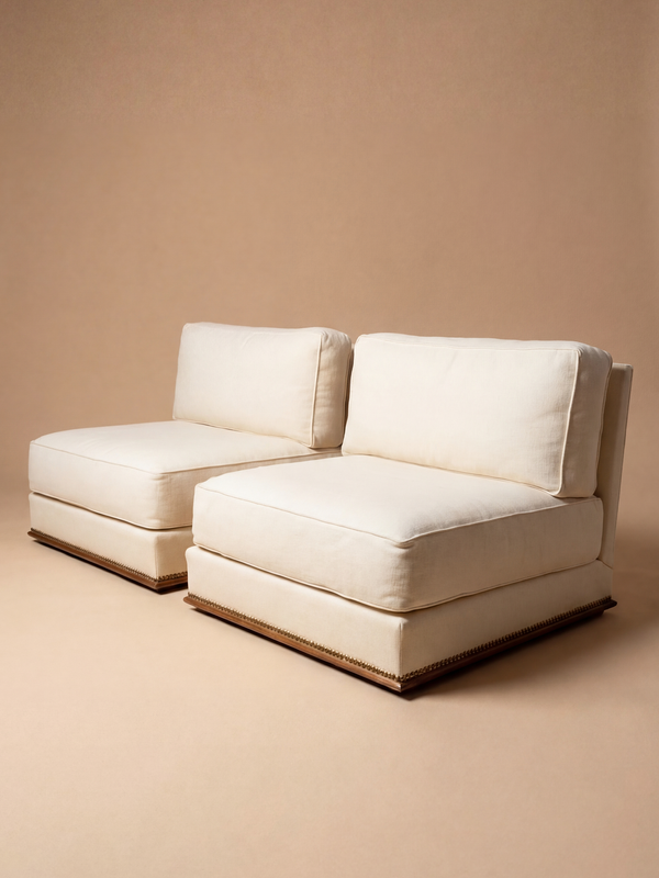 This pair of low chairs, very wide and comfortable, made in France around the 1940s in the spirit of Paul Dupré-Lafon, stands out for its effortless and understated elegance. The lines are simple, almost self-evident, shaping a low, grounded and perfectly balanced silhouette. The generous cushions, both defined and inviting, rest on a base subtly highlighted by a nailhead trim. The whole composition reflects a controlled restraint, where comfort is expressed without heaviness, in a language that is both soft and structured. Both restrained and deeply refined, these chairs embody the quiet luxury characteristic of mid-century French design. They integrate naturally into curated interiors, bringing calm, coherence and presence. The armchairs are presented with their original upholstery. Reupholstery is recommended and can be fully carried out in our workshop, with careful attention to preserving the original spirit and proportions.