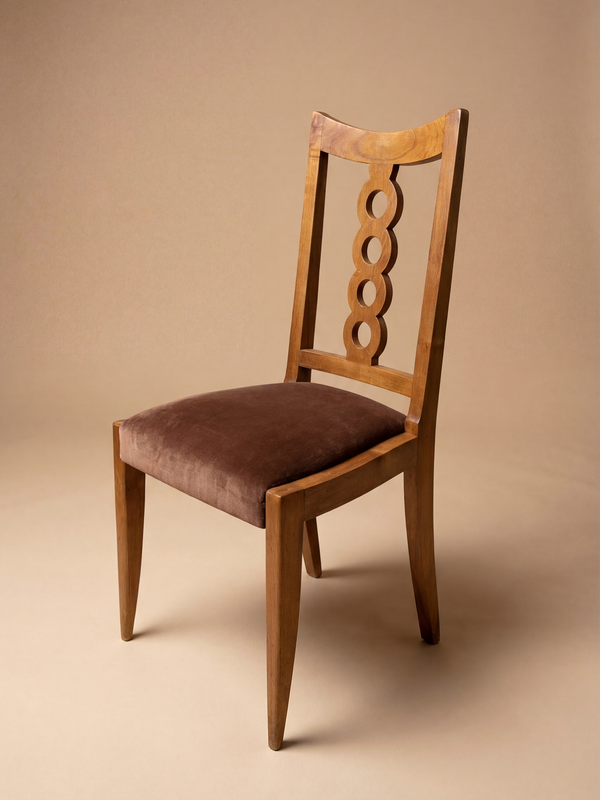 A defining example of Victor Courtray’s work, a key figure of Basque regionalist furniture. The warm walnut highlights a rigorous construction and well-balanced proportions. The structured lines, cut-out backrests, and solid legs reflect strong Basque influences, blending local tradition with the restrained modernity of the 1930s–1940s. Each chair carries a presence that is both understated and assertive. Ideal around a characterful dining table, they bring an authentic and timeless touch. A cohesive set, representative of Basque craftsmanship, and increasingly sought after today.