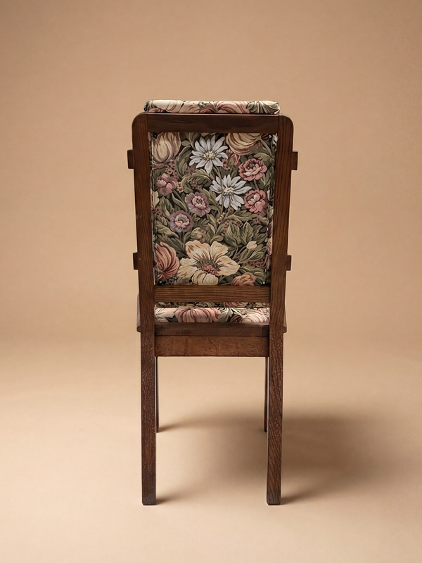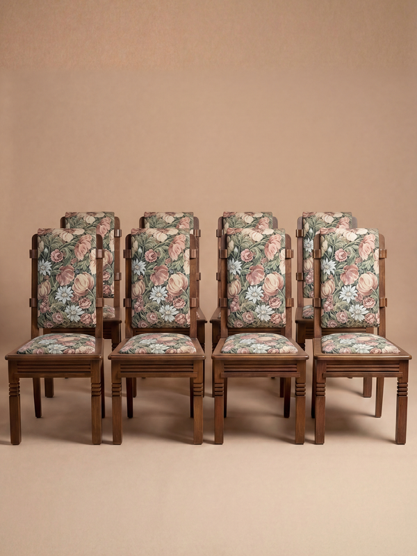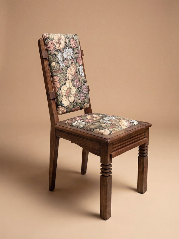 A refined ensemble with strong, architectural lines, characteristic of Dudouyt’s work, where simplicity of form meets a bold, structured presence. The design feels both rigorous and grounded. Crafted in solid oak, the chairs display a rich patina, highlighting the interplay of volumes and the sculptural detailing of the legs and stretchers. The upholstered backs introduce a decorative softness, balancing the composition. Emblematic of the French regionalist aesthetic of the 1940s, these chairs offer both comfort and a distinctive silhouette, ideal for anchoring a dining space with character. Signed. The chairs are presented with their original upholstery. Reupholstery is recommended; this can be fully carried out in our workshop, respecting the original proportions and spirit.